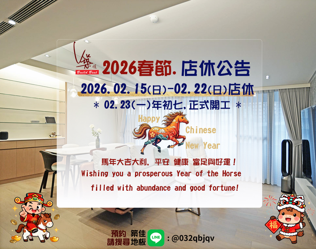 店休公告: 築佳地板於2026/02/15(日)~2026/02/22(日)休年假 *02/23(一)大年初七,正式開工! 祝福大家,2026駿馬奔騰,福氣滿門 Horse連連(好事連連)、馬尼多多(Money多多) Wishing you a prosperous year of the horse filled with abundance and good fortune!